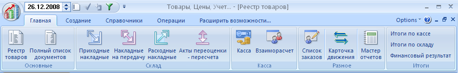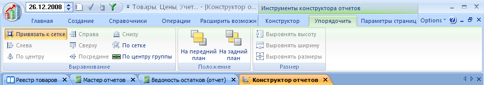 Зарегистрированные пользователи, ВНИМАНИЕ! Ввиду принципиальных изменений в системе отчетности, при установке обновления будет автоматически заменен файл settings.mdb. Зарегистрированные пользователи должны повторно ввести свои ответные ключи, полученные при регистрации программы. Пользователи, устанавливающие программу впервые, либо еще не прошедшие регистрацию, устанавливают ТЦУ3 в обычном режиме. 1. Новые значки.  2. Новый конструктор отчетов. Мы постарались реализовать данный конструктор в свете самых последних программных тенденций. Концептуально он очень похож на конcтруктор отчетов MS Access 2007, и не вызовет вопросов у людей, умеющих делать отчеты в Access. Когда отчет подготовлен к печати и выведен на экран для просмотра, можно воспользоваться конструктором. Для этого по правой кнопке мыши (или на контекстной вкладке) жмем значок "Конструктор". Откроется окно следующего вида.  Обратите внимание на группу контекстных вкладок конструктора Вкладка "Упорядочить".  Вкладка "Параметры страницы".  Отчеты сохраняются в формате XML и могут быть подключены в мастере отчетов для дальнейшего использования. В дальнейшем конструктор будет развиваться. В частости, планируется реализовать встроенный редактор SQL - запросов. 3. В акте переоценки реализована возможность переоценивать весь товар целиком на заданный процент.  Для этого выделяем нужные товары в акте переоценки, нажимая на селектор записи перед наименованием (синий квадратик), и удерживаем Shift либо Control. После чего меняем процент надбавки (положительное значение) или скидки (отрицательное значение процента). Цены для выделенных товаров будут изменены на указанный процент. Чтобы выделить все товары, достаточно нажать на треугольник в верхнем левом углу таблицы. Обратите также внимание на переключатели округления. Задавая нужное значение округления, вы получите округленные цены в колонке "Цена после". В следующем релизе ПРОИЗВОДСТВО!!!