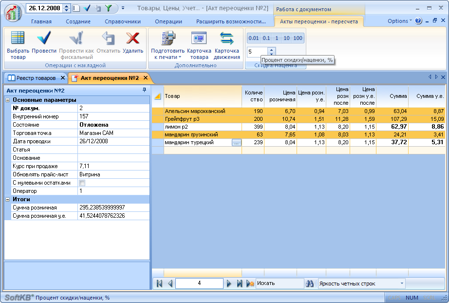 - В расходной накладной процент скидки теперь задается в разделе "Основные параметры". В разделе "Итоги" показано значение результрующей скидки (с учетом округлений и ограничений по скидкам).