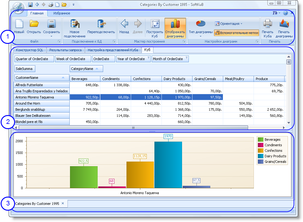 Здесь и далее в справке приведены формы, отображающие настройки куба из файла куба "Categories By Customer 1995.sfcb", включенного в дистрибутив приложения SoftKuB. Куб имеет подключение к тестовой базе данных компании ©Microsoft из офисного пакета MSOffice Northwind, также включенной в дистрибутив ("NWIND.MDB").