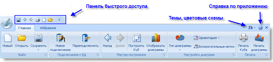 В качестве панели инструментов для быстрого доступа к различным функциям и настройкам приложения используется современный офисный компонент - лента, или риббон (ribbon). Это новая панель инструментов, которая впервые была использована в офисном пакете MS Office 2007: