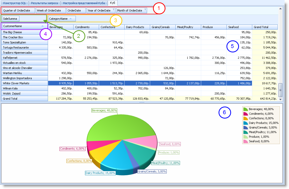 | 6. | Окно диаграмм - визуальное представление куба, отражение измерения куба в виде графиков и диаграмм. |