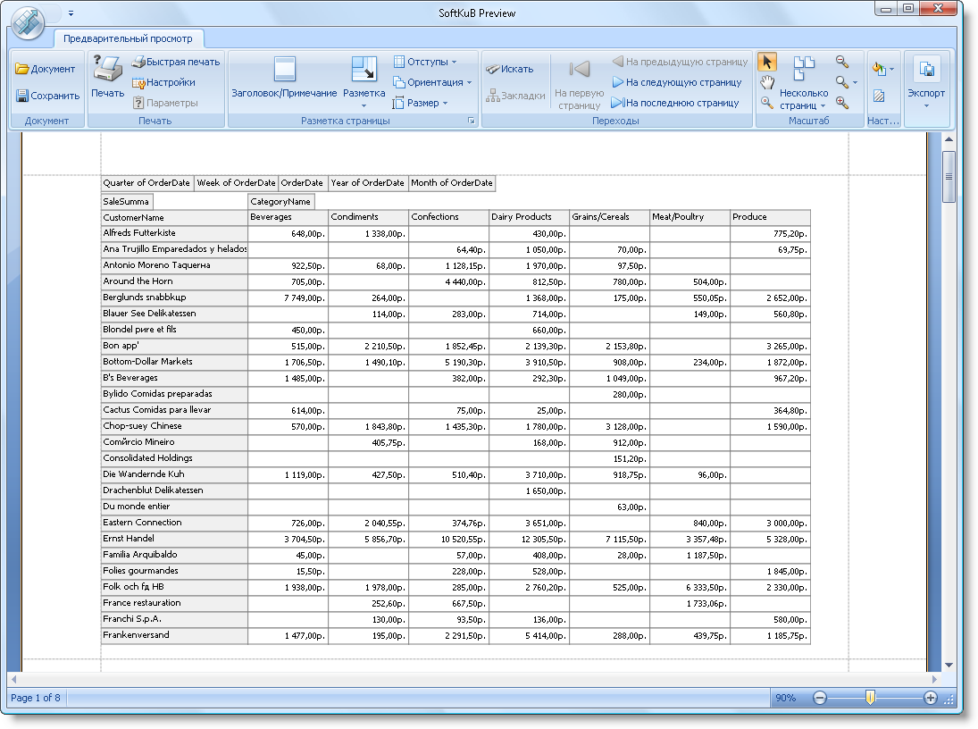 Форма предварительного просмотра куба. Перед печатью позволяет задать разметку страницы, заливку, водяной знак и ряд других стандартных свойств. Также позволяет произвести сохранение документа и его экспорт в самые распространенные форматы.
