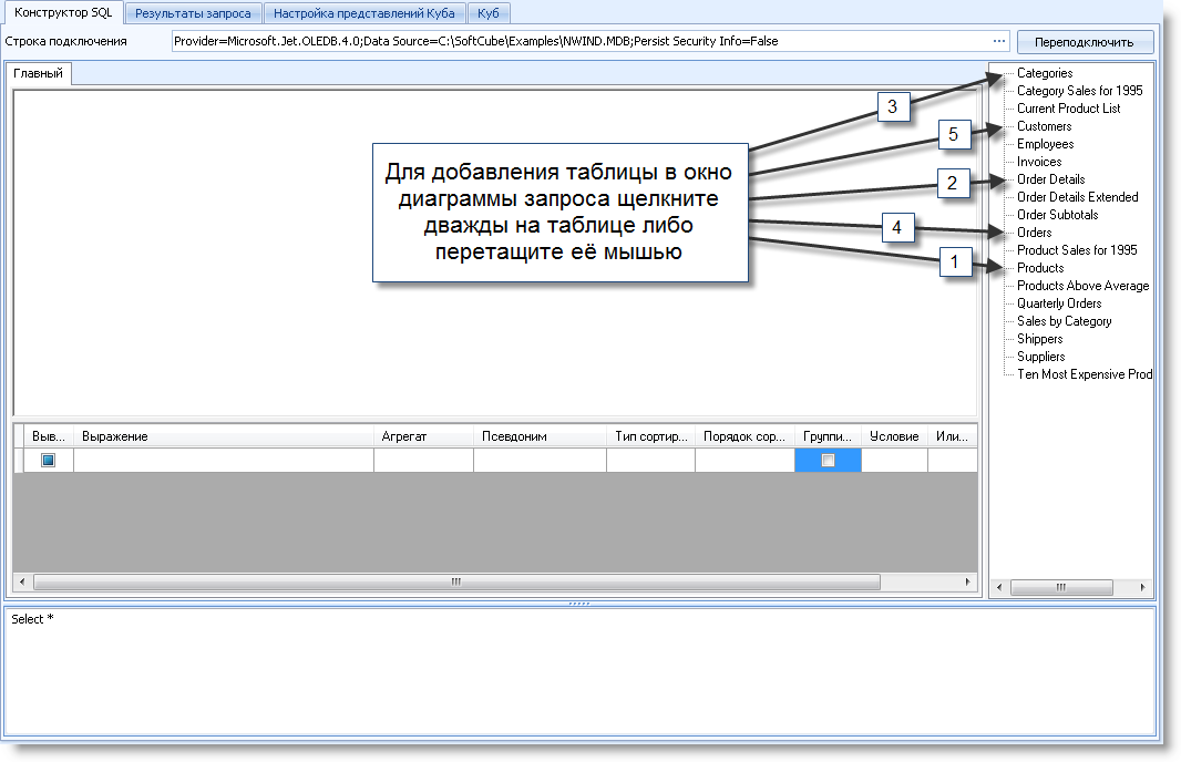 Подключение установлено. После этого в конструкторе создайте запрос на выборку данных. Для этого выберите таблицы, на основе которых будет создан запрос. В дереве таблиц и запросов щелкните на требуемой таблице дважды либо перетяните её мышью в окно диаграммы запроса в последовательности, обозначенной на рисунке: