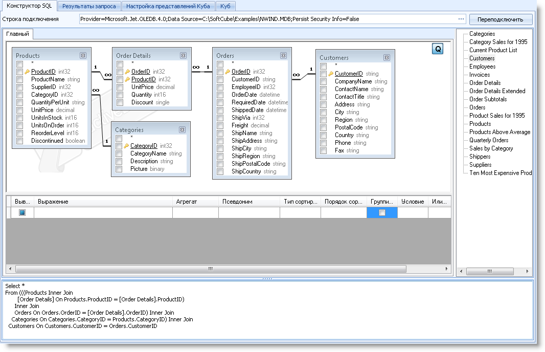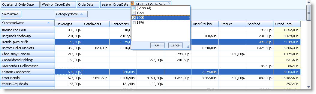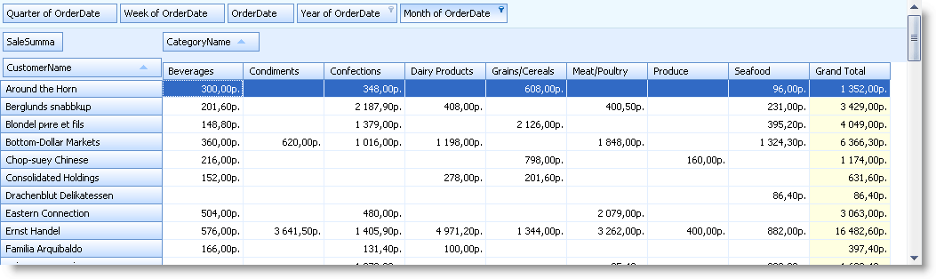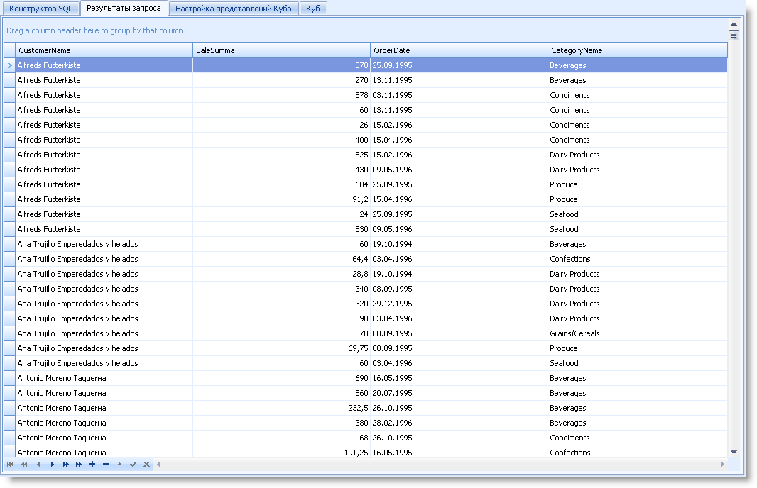 Также помните, что двойной щелчок по ячейке позволяет использовать Drill Down для переходов между измерениями куба. Будет открыта дополнительная таблица, преобразующая агрегированное значение в детальное представление данных. Таким образом, вы можете осуществлять визуализацию данных по любому измерению куба. Степень детализации зависит от запроса, однако не стоит забывать, что сложные запросы на больших объемах данных могут привести к падению быстродействия. В завершение раздела справки - сохраните полученный куб. Назовите его "Categories By Customer 1995.sfcb"