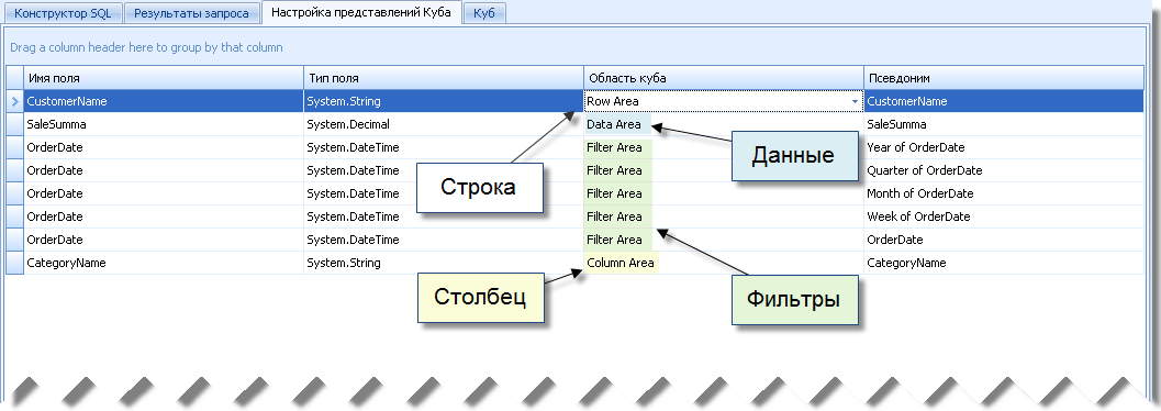 Данный результат еще не является кубом, однако он уже содержит все данные, на основе которых тот строится. Для превращения этой таблицы в многомерный массив и поддержки функции вращения (пивотинг) данных остается пройти один шаг - щелкните кнопку "Далее" либо вкладку "Настройка представлений куба":