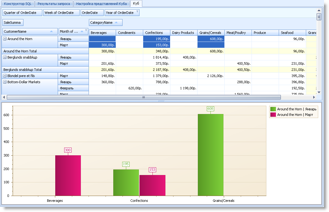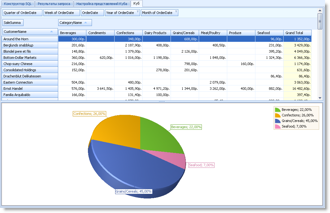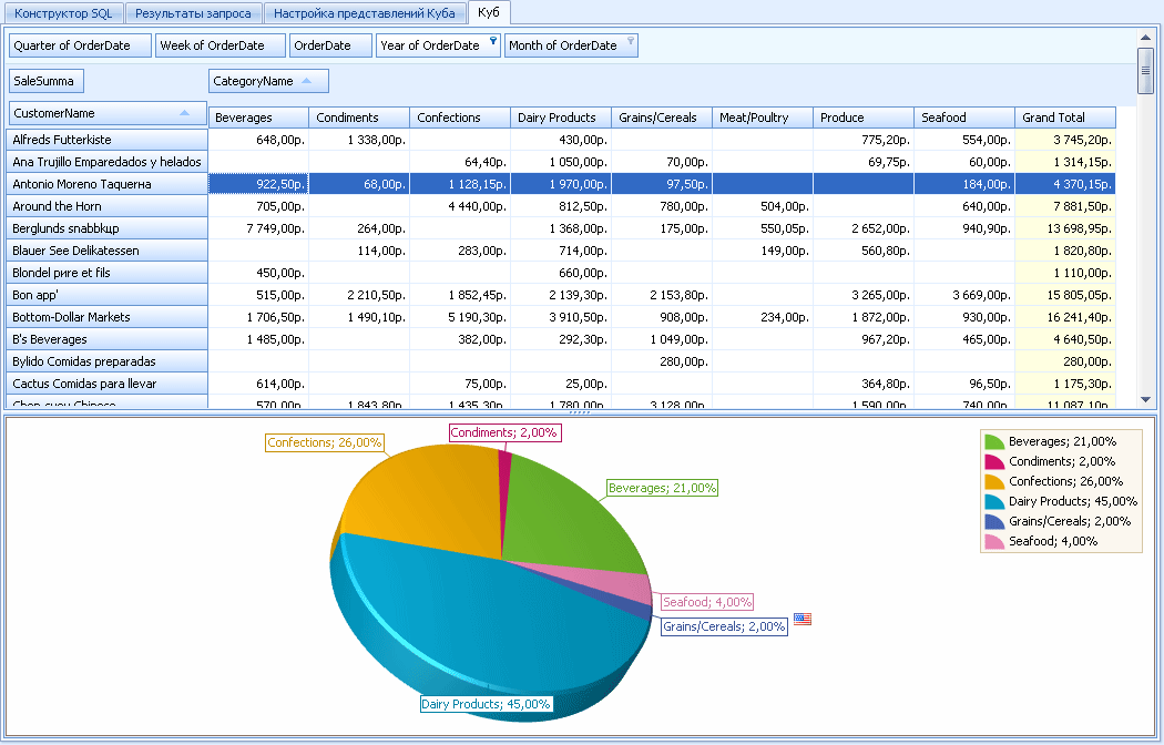 Здесь Вам необходимо определить, какие поля таблицы будут являться строками, какие - столбцами, какие - данными, отображаемыми на пересечении строк и столбцов, а также какие поля запроса будут фильтрами. Обратите внимание - здесь в качестве фильтров дополнительно (по сравнению с запросом на первом шаге) появились поля с псевдонимами "Year", "Quarter", "Month", "Week" - выделяющие соответственно из даты год, квартал, месяц, неделю. Данные поля добавлены мастером автоматически после анализа запроса и рассчитываются на основании поля "OrderDate". Эти поля соответствуют году, кварталу, месяцу, неделе даты заказа. На следующем шаге можно будет менять расположение полей запроса на кубе простым перетаскиванием мышью, "вращая" куб и осуществляя, так называемый, pivoting. Обратите внимание - вы можете задавать множество строк (вложение строк) и множество столбцов (вложение столбцов), множество фильтров и множество отображаемых данных, однако визуально восприятие данных значительно усложняется, так что не переусердствуйте на данном этапе, достаточно одного среза по строкам (клиенты) и одного (категории товаров) - по столбцам. Переходите к финальному шагу - щелкните кнопку "Далее" или вкладку "Куб":