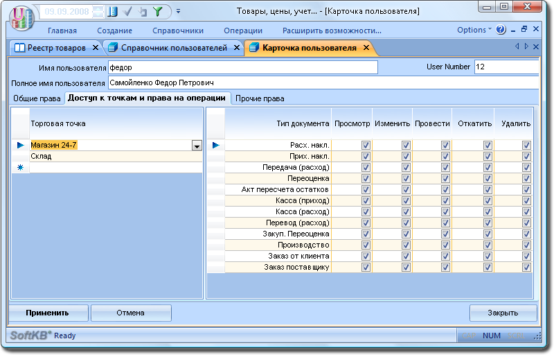 In the left pane of the tab "Access points, and the right of operation" from the drop down list, choose the right outlets. After you select it in the right pane for it to install the required permissions to operations. According to this scheme is setting the permissions of the current user for other outlets. After clicking "Apply" the settings take effect, the points become available to the user.